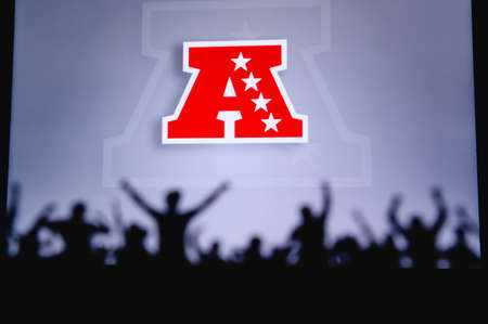 American Football Conference AFC, . Fans support professional team of American National Foorball League. Silhouette of supporters in foreground. Logo on the big screen.