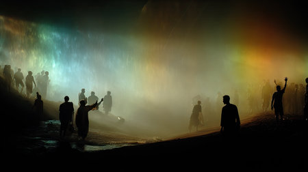 Figures are silhouetted against a luminous arc of light in an atmospheric composition. The image showcases variations in color and texture created by the light. Suggesting an outdoor setting, the artwork has a potential for usage in conceptual, artistic, and design-oriented applications.