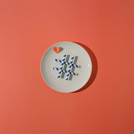 Hashtag made of striped paper straws with red heart on white plate. Minimal concept.