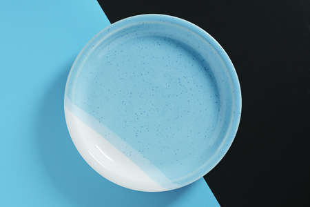 Empty plate on a contrasting yellow and blue background. Minimalism flat lay image with copy space.