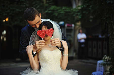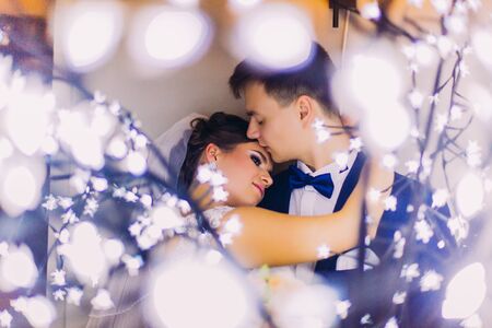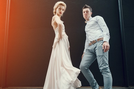 The lovers give flowers to the bride and kissed happy and couple love standing in wedding studio