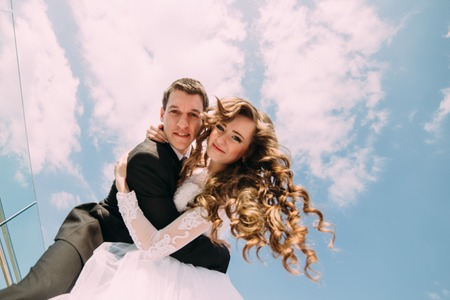 Smiling bride and groom posing for the camera against blue sky with clouds, view from below.