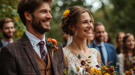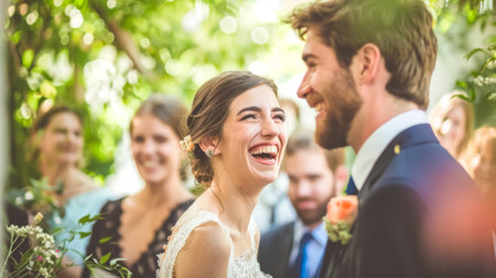 A radiant bride and groom share a heartfelt moment, surrounded by smiling friends and family in a lush outdoor setting. The scene captures the essence of love and joy, with the bride holding a bouquet of white roses, embodying elegance and happiness on their special day.