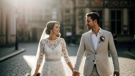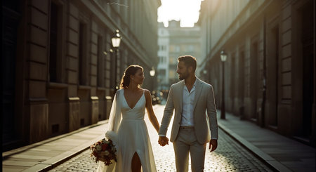 A smiling bride and groom, dressed in white and beige, walk hand in hand down a charming cobblestone street lined with historic buildings and street lamps, surrounded by warm sunlight.