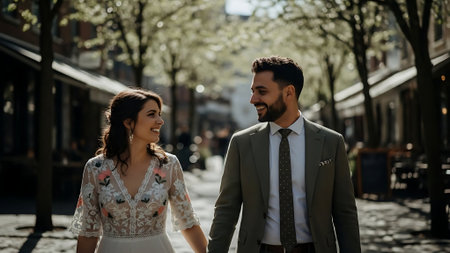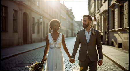 A happy African American couple walks hand in hand down a charming city street on their wedding day