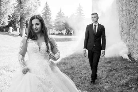Beautiful bride and groom on their wedding day. Newlyweds are walking in the park.