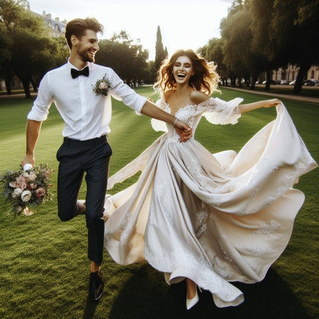 Joyful couple celebrates their wedding day in a beautiful garden during the afternoon