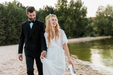 Wedding couple holding hands and walking on beach, laughing bride holding high heels in hand