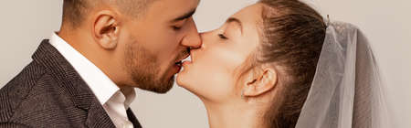young bride and groom kissing with closed eyes isolated on gray, banner
