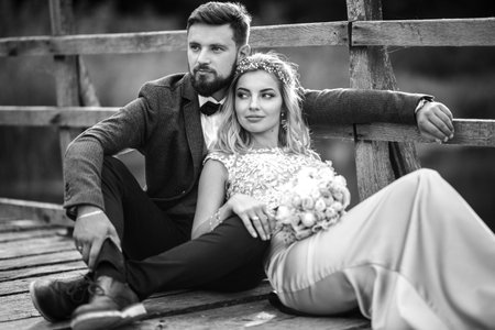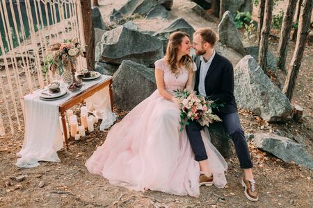 Attractive couple newlyweds bride and groom laughs and smiles to each other, happy and joyful moment. Man and woman in festive clothes sit on the stones. Wedding ceremony outdoors. Close-up portrait