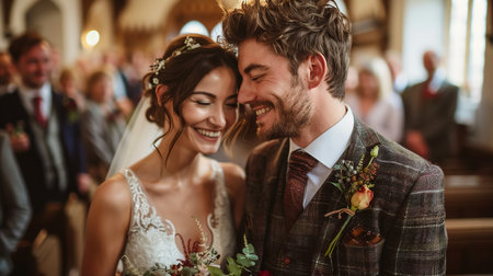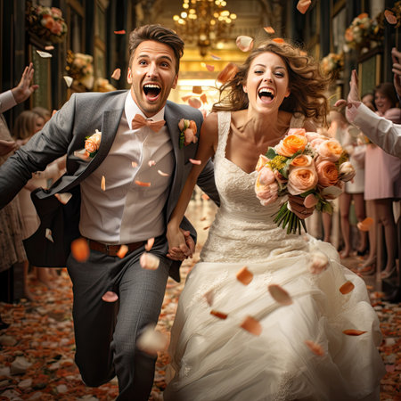 Happy wedding pictures of the bride and groom at their wedding ceremony. Wedding custom sprinkled with rice and grain, Generative AI