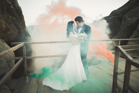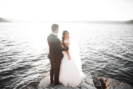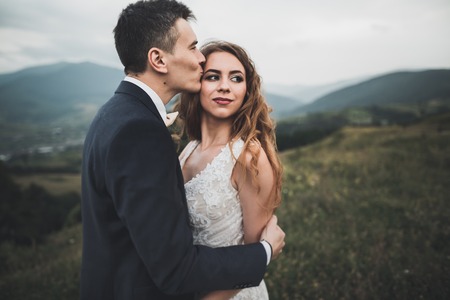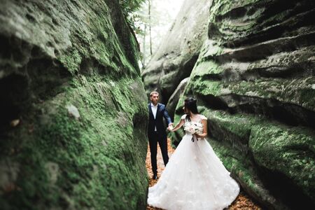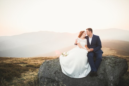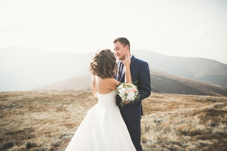 Happy beautiful wedding couple bride and groom at wedding day outdoors on the mountains rock. Happy marriage couple outdoors on nature, soft sunny lights