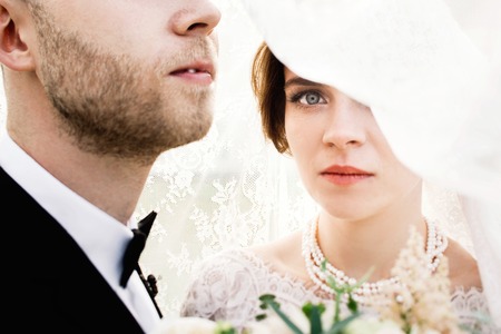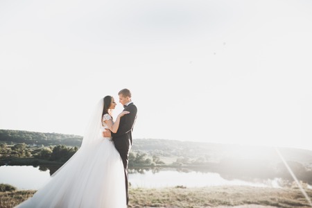 Wedding couple on the nature is hugging each other. Beautiful model girl in white dress. Man in suit. Beauty bride with groom. Female and male portrait. Woman with lace veil. Lady and guy outdoors