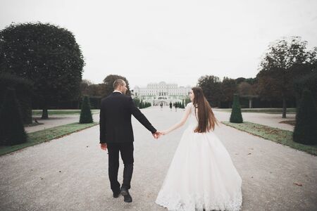 Beautiful wedding couple walking on the street in the city. Bride and groom