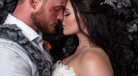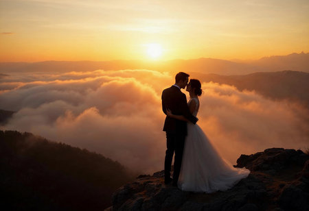 As the sun dips below the horizon, a couple shares a tender embrace atop a rocky outcrop, surrounded by a sea of vibrant clouds. The warm glow enhances their joyous celebration.