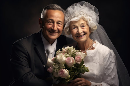 Mature Couple Celebrates Wedding with Joy and Laughter, Showered in Colorful Confetti Petals.
