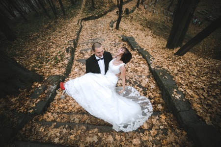 Wedding couple having fun on their wedding day. Bride and groom dancing