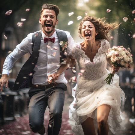 Newlyweds laugh amidst a shower of rice surrounded by friends on their wedding day