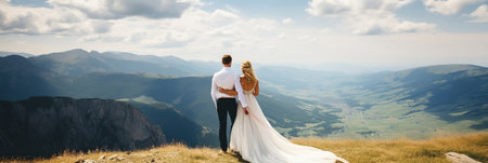 Newly Wedded Bride Groom in mountains. Wedding Day Ceremony