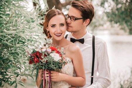 Stylish couple of happy newlyweds posing in park on their wedding day. Sexy kissing stylish couple.