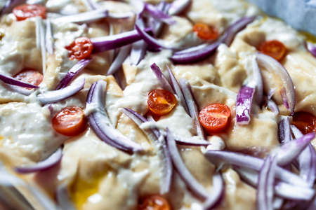 vegan homemade focaccia bread with cherry tomatoes and onions before being cooked, healthy plant-based food recipes