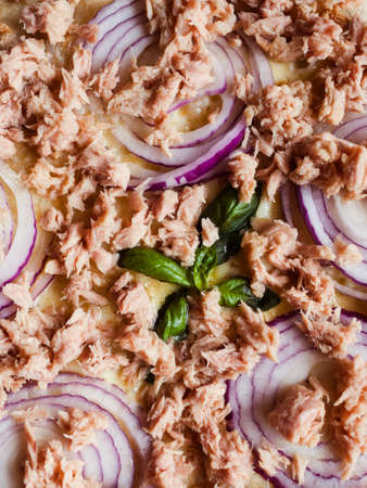 Tuna pizza with red onions background. Tasty lenten meal recipe concept