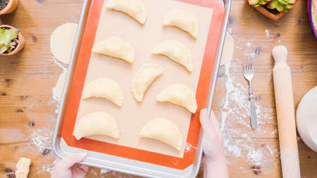 Traditional raw curry puffs stuffed chicken which are preparing for bake and frying. Top view.
