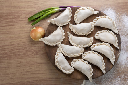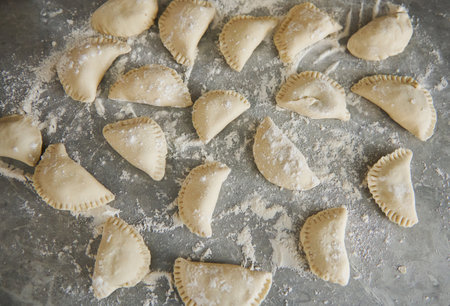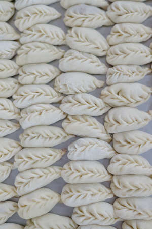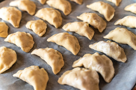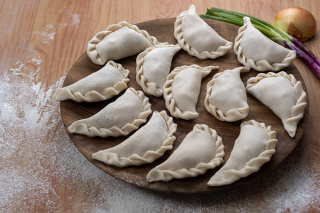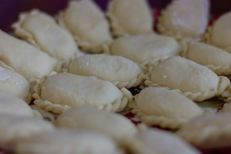 Close-up of freshly prepared raw dumplings, traditional homemade food with dough wrapping and twisted edges, ready for cooking. Perfect for illustrating traditional cuisine, comfort food, and cooking process concepts.