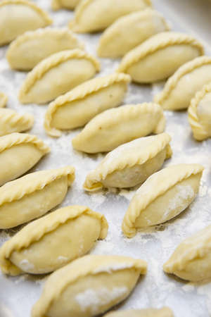 Raw dumplings or vareniks, traditional Russian and Ukrainian food, close up