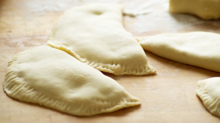 A person making Argentinian empanadas stuffed with vegetables and squash on wooden surface
