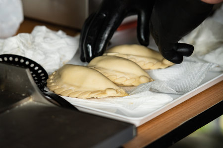 A person wearing black gloves is preparing empanadas, baked or fried turnover consisting of pastry and filling, common in Southern European, and Latin American countries
