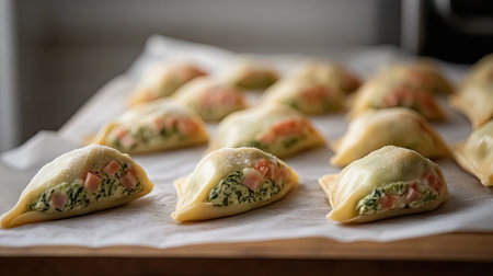 A serene image showcasing freshly made dumplings filled with vibrant spinach and tomato, arranged artfully on a wooden board, inviting culinary creativity.