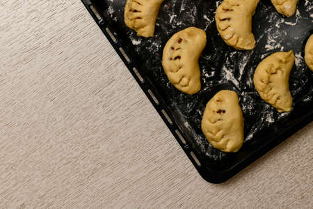 Sweet pies made from yeast dough, raw semi-finished products cooked and laid out on a black baking tray. Fragment of a corner on a light-colored countertop.