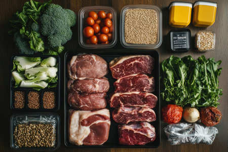 A vibrant flat lay of fresh ingredients on a wooden table, showcasing an array of meat cuts, colorful vegetables, herbs, and legumes, perfect for creating healthy meals.