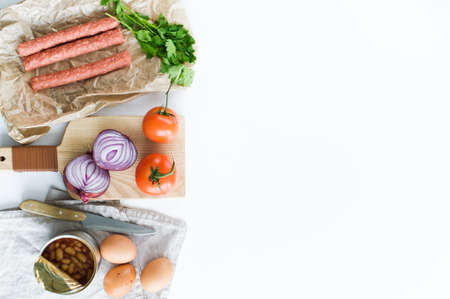 Raw ingredients for cooking pasta on a white background. Top view.