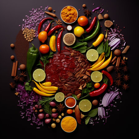vegetables, spices, and other ingredients arranged in a beautiful and artistic way, created with generative ai