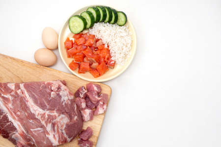 Pet dog food from natural ingredients. Raw meat, fish, vegetables, eggs and salad. concept of a correct balanced and healthy nutrition for pet, flat lay
