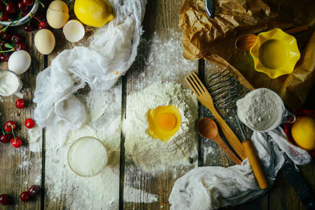 Baking cake ingredients - bowl, flour, eggs, tomato