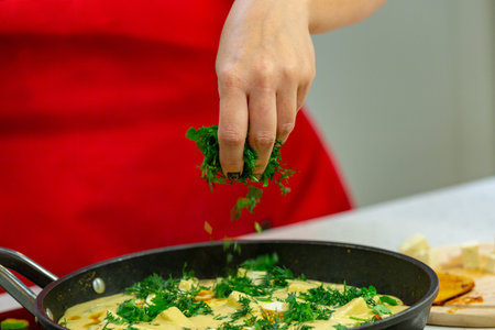 woman chef preparing omelette with herbs at a kitchen. Hands close up