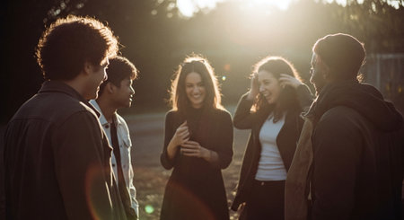 Group of friends laughing together on a city street in the evening