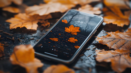 A smartphone resting on vibrant autumn leaves, capturing the essence of fall with its colorful display and natural surroundings.