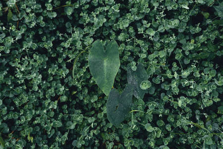 Green leaf background. Processing under the film in cold colors. Helichrysum petiolare, silver-bush everlastingflower. Asteraceae family