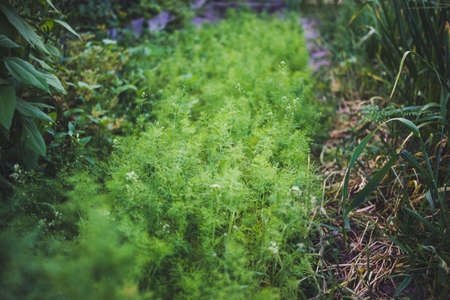 Fresh green young dill in the garden at sunset