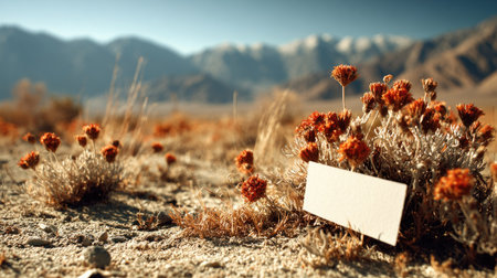 A close-up captures desert vegetation with red-orange flowers and a blank sign. The scene presents a dry, textured landscape under natural light. The composition features a shallow depth of field, with the focus on the foreground. Suitable for editorial and commercial applications.