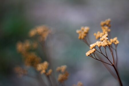 Close up of an autumn dried umbrella shaped wild flower on blurred forest background, selective focus