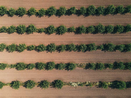 Farmlands with crops and agricultural machinery from above. Countryside with farmland.