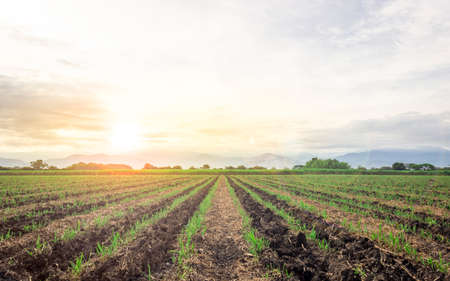 Young fresh green plants corn growing on farmland or field. Fertile black rich soil, chernozem. Maize view on golden hour, sunny rays background. Agriculture, vegetable, organic, cultivation.