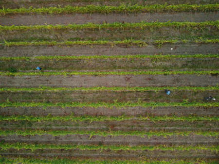 This captivating aerial photograph showcases lush green rows of a vineyard, illustrating the beauty of agriculture in a serene rural landscape. The vibrant hues and well-structured rows indicate a healthy crop.