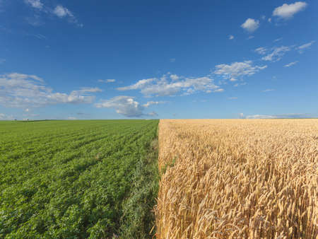 Wheat and clover fields with beautiful sky at idyllic summer day