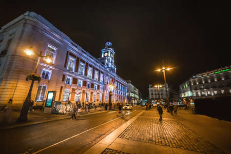 Madrid, Spain - January 26, 2020: Many people walking on Puerta del Sol, a public square in Madrid and one of the best known and busiest places in the city.
